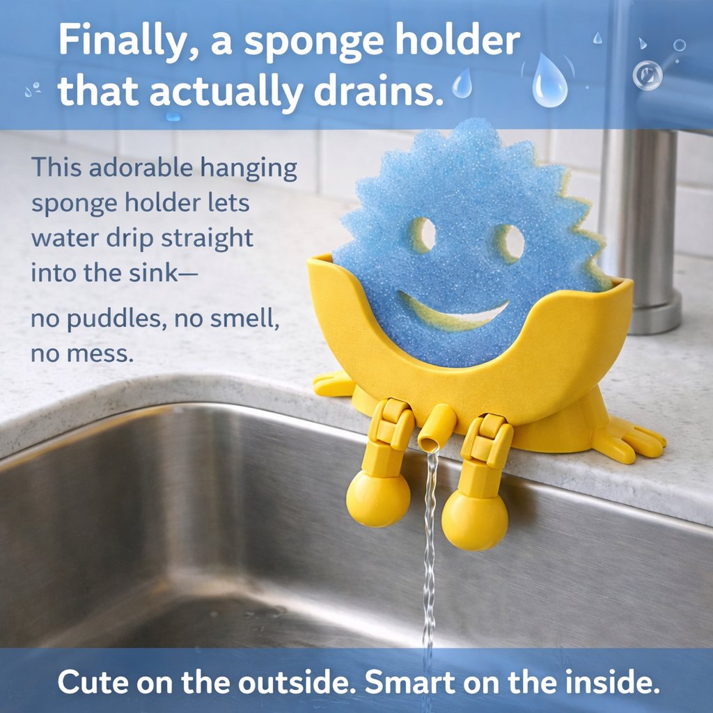 Made with a fun character design and movable legs, it hangs perfectly on the edge of your sink—adding personality to your kitchen while helping your sponge air-dry naturally.